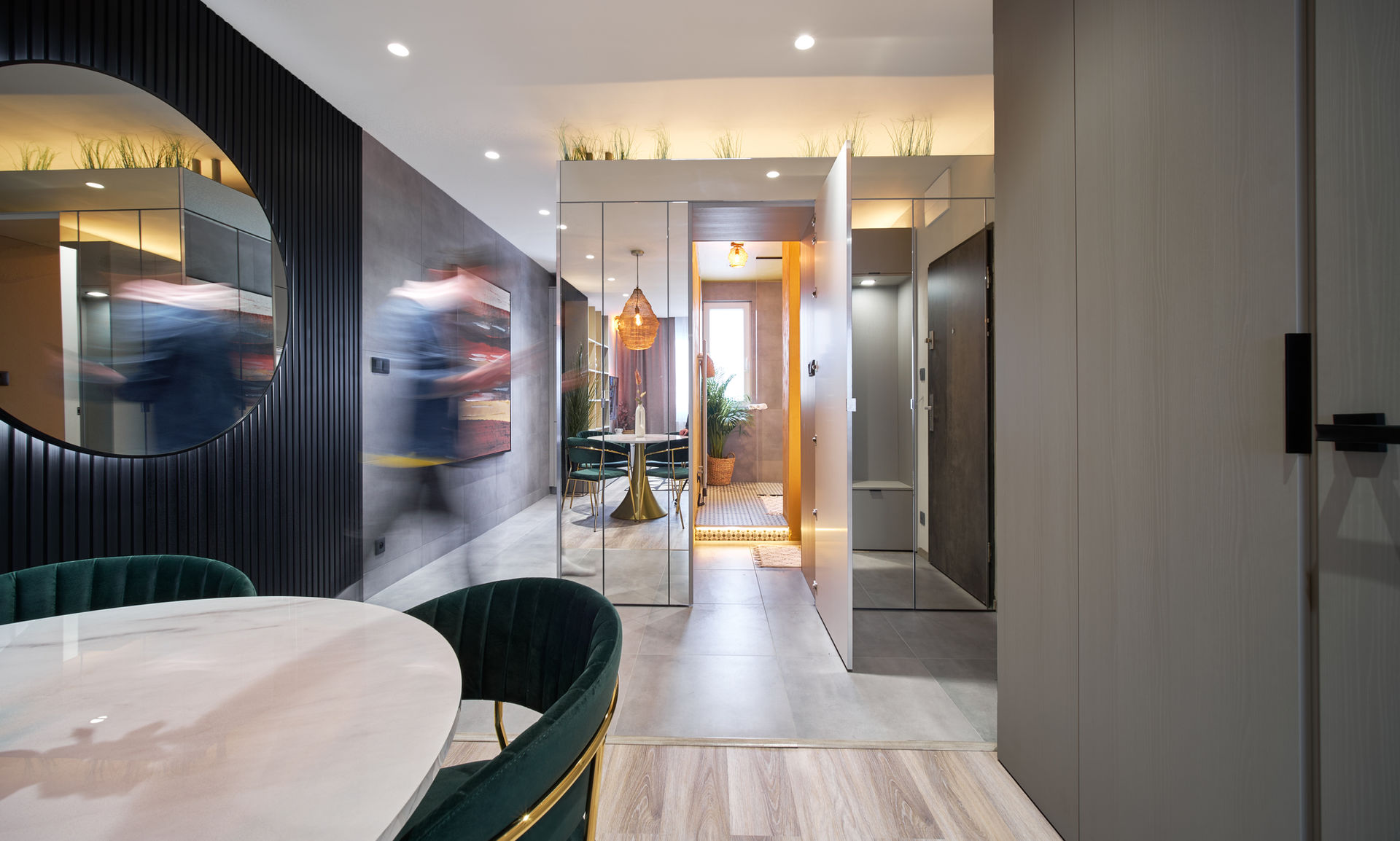 V PORA sme vytvorili interiér dvojizbového bytu s úžasnými skrytými priestormi, ktoré sa nachádzajú za elegantnými skrinovými segmentmi. Tmavé lamelové tóny dodávajú priestoru dramatický charakter a vytvárajú pôsobivý vizuálny efekt.